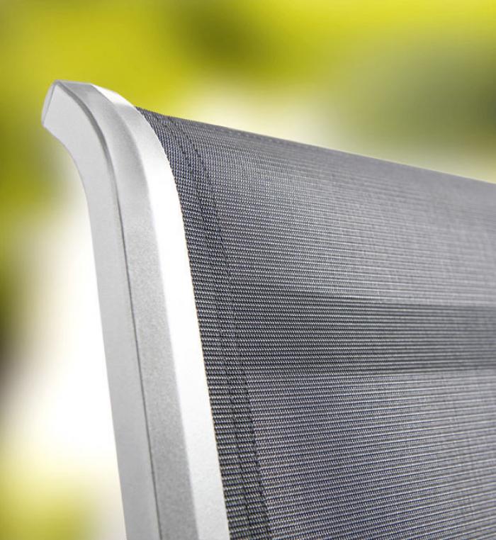 Sieger Calvi Stapelsessel Aluminium graphit. So lassen sich die Konturen der Rückenlehne, die Anmutung der Gewebe-Struktur und die Qualität der Beschichtung des