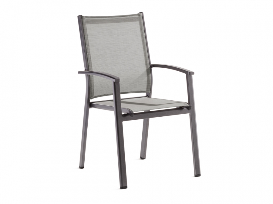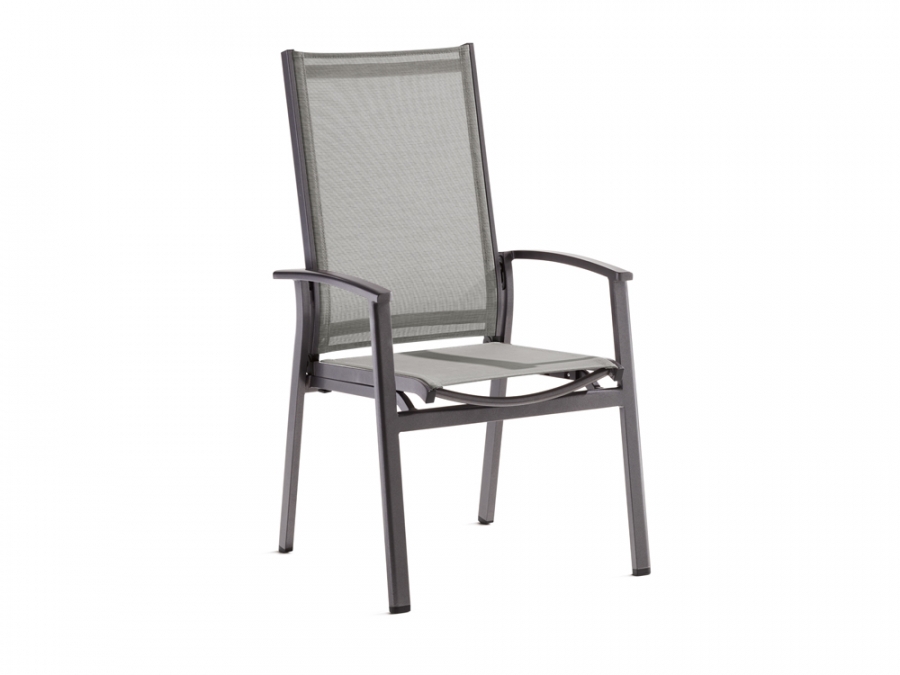Die Tischplatte besteht aus widerstandsfähigem Polytec in der Farbe Beton dunkel. Dieses Material ist besonders pflegeleicht, kratzunempfindlich und auf den dauerhaften Einsatz im Freien ausgelegt. Die hellgraue Gewebefarbe der Bespannung bildet einen dezenten Kontrast zum eisengrauen Untergestell und rundet das moderne Erscheinungsbild des Gartenmöbel-Set harmonisch ab.