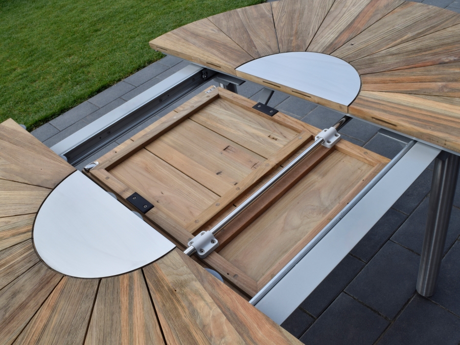 Der Zebra Catax Ausziehtisch Edelstahl aus recyceltem Teak 135x135-185cm verfügt über eine ausziehbare Tischplatte mit komfortablem Synchronauszug. Durch dieses System lässt sich der Gartentisch leicht und gleichmäßig vergrößern. Die integrierte Butterfly-Funktion ermöglicht es, die Erweiterungsplatte platzsparend im Tisch zu verstauen und bei Bedarf schnell aufzubauen. So wird aus einem kompakten Gartentisch von 135 cm Breite eine großzügige Tafel mit etwa 185 cm Breite. Diese Flexibilität macht den Gartentisch ideal für wechselnde Anforderungen, von der kleinen Alltagsrunde bis zur großen Gartenfeier. Das hochwertige Gestell aus Edelstahl sorgt dabei für eine zuverlässige Stabilität, selbst im voll ausgezogenen Zustand.