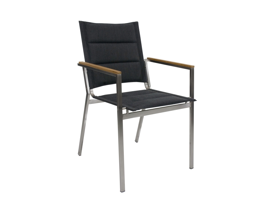 Beim Zebra Everest Sessel gepolstert kommt eine Materialkombination zum Einsatz, die auf Langlebigkeit und Komfort ausgelegt ist. Der Kern der Sitz- und Rückenflächen besteht aus formstabilem Schaumstoff, der für ein weiches, aber unterstützendes Sitzgefühl sorgt. Das tragende Edelstahlgestell verleiht dem Gartenstuhl hohe Stabilität und ist zugleich korrosionsbeständig und pflegeleicht. Die Armauflagen werden aus ausgesuchtem Teakholz gefertigt, das durch seine angenehme Haptik und die natürliche Maserung einen wertigen, warmen Kontrast zu der kühlen Metallstruktur bietet. Die Bespannung in der Gewebe-Farbe midnight-grey ist robust ausgelegt und unterstützt das moderne, klarlinige Design des Sessels.