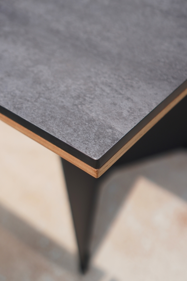 Beim Gartenmöbel-Set Ajax-Tamax setzt Zebra auf eine durchdachte Materialkombination für Stabilität, Komfort und Langlebigkeit. Das Gestell besteht aus verzinktem Stahl in der Farbe graphite, was eine robuste Basis mit korrosionshemmenden Eigenschaften bietet. Die Armlehnen werden aus recyceltem Teakholz gefertigt und sorgen für eine natürliche, warme Haptik. Die Tischplatte kombiniert widerstandsfähiges HPL High Pressure Laminate mit recyceltem Teakholz und stellt damit eine strapazierfähige und pflegeleichte Oberfläche für den täglichen Einsatz im Freien bereit.