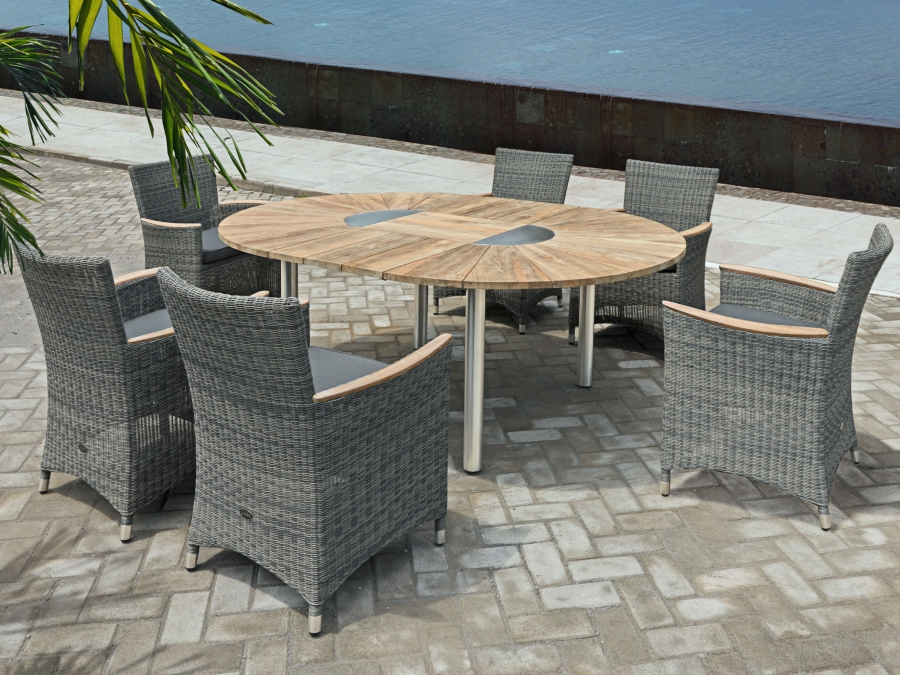 Die attraktive Sitzgruppe besteht aus einem Aluminiumrahmen, umhüllt von 2,5mm starkem Kunststoffgeflecht in grau-schwarz. Die Tischplatte ist aus hochwertigem recyceltem Teakholz gefertigt und wird von stabilen Edelstahl-Tischbeinen gestützt. Die dunkelgrauen Polster bieten einen angenehmen Kontrast und erhöhen den Komfort.
