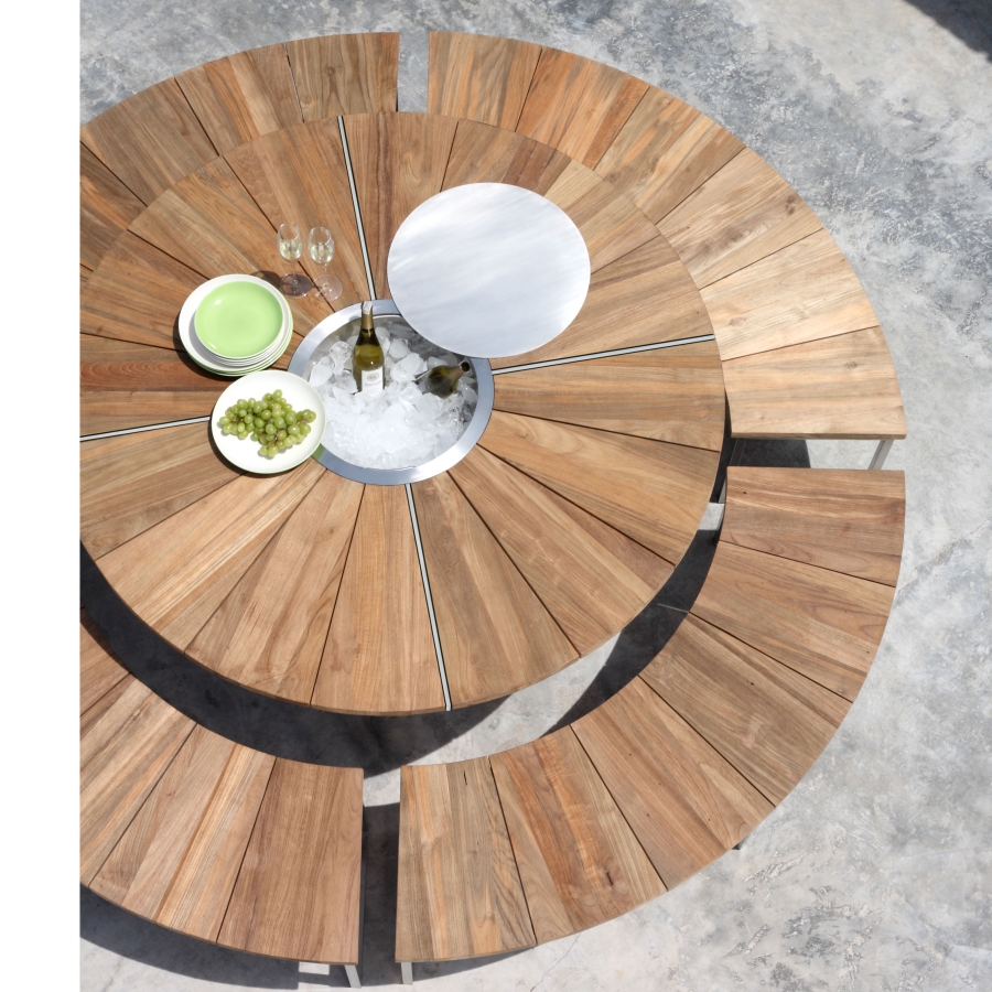 Das Gartenmöbel-Set Oryx Edge-Onyx besteht aus einem Edelstahl-Gestell und einer Tischplatte sowie Sitzflächen aus recyceltem Teakholz. Diese Holzausführung strahlt eine besonders warme und wohnliche Atmosphäre aus.