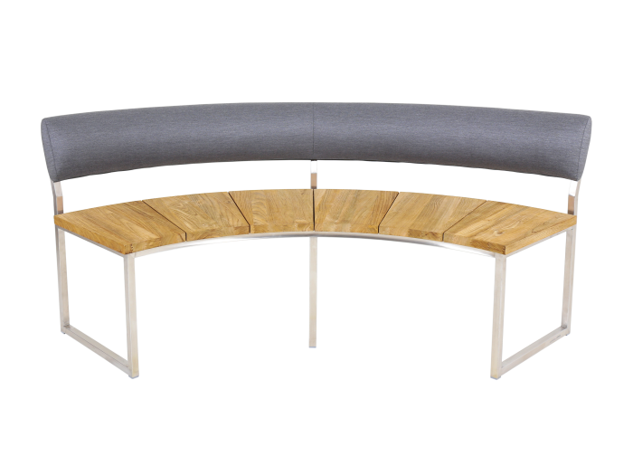 Das Gartenmöbel-Set Setax-Oryx Edge-Onyx besteht aus einem Edelstahl-Gestell und einer Tischplatte sowie Bank-Sitzfläche aus recyceltem Teakholz. Diese Holzausführung strahlt eine besonders warme und wohnliche Atmosphäre aus. Die Armlehnen der Sessel sind ebenfalls aus Teakholz gefertigt und bieten einen harmonischen Kontrast zur dunklen Bespannung.