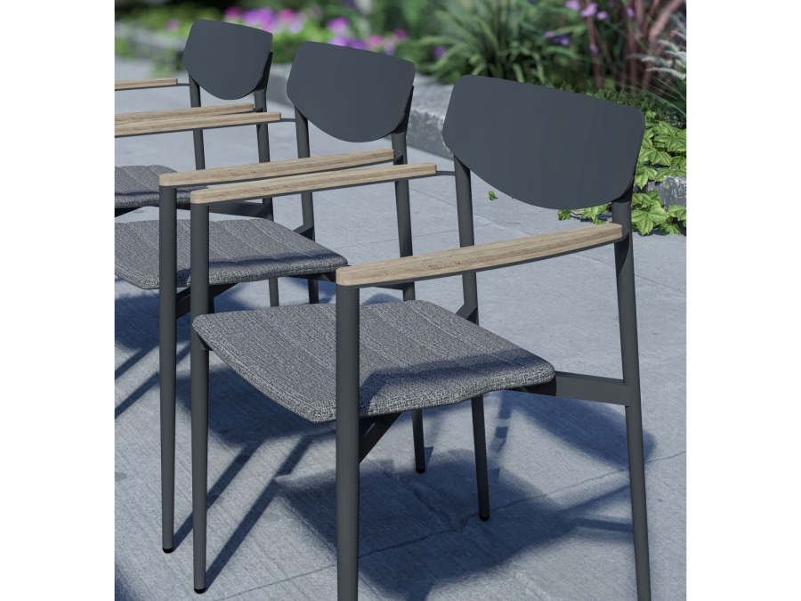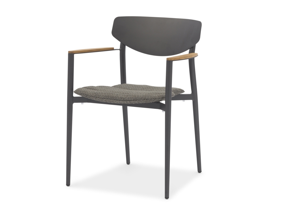 Der Zebra Hornet Stapelsessel Aluminium graphite verfügt über ein Gestell aus robustem Aluminium, das in der Gestellfarbe Graphit hochwertig pulverbeschichtet ist. Diese Oberfläche sorgt für hohe Beständigkeit gegen Feuchtigkeit und Sonneneinstrahlung und unterstreicht den modernen Charakter des Gartenstuhls. Die Armlehnen bestehen aus recyceltem Teakholz, das dem Sessel eine natürliche, warme Note verleiht und gleichzeitig ressourcenschonend ist. Der Polsterbezug aus Sunproof Fontelina in der Polsterfarbe Sutton grey ist strapazierfähig und für den Außenbereich konzipiert. Der Kissenbezug besteht zu 100 % Olefin, einem textilen Material, das sich durch hohe Langlebigkeit, gute Farbbeständigkeit und angenehme Haptik auszeichnet.