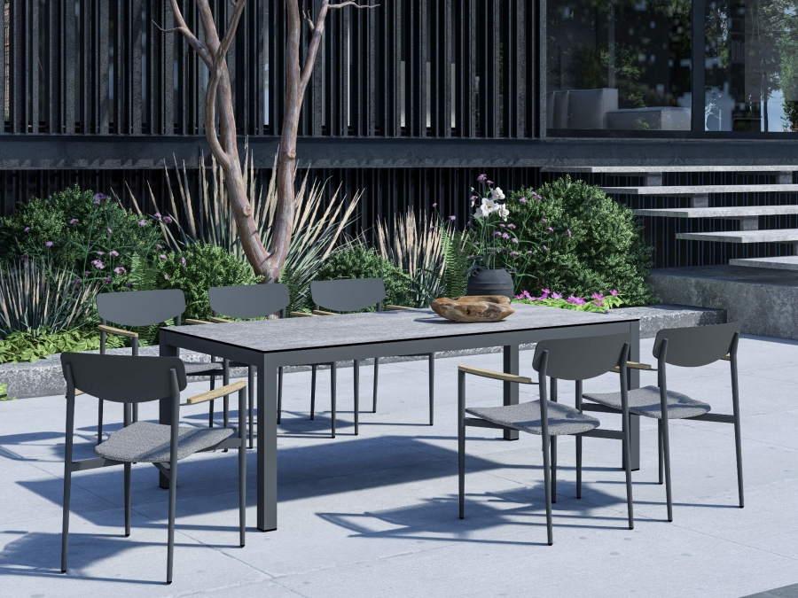 Durch die neutrale Gestellfarbe Graphit und die zeitlose Polsterfarbe Sutton grey lässt sich der Zebra Hornet Stapelsessel Aluminium graphite vielseitig mit weiteren Gartenmöbeln kombinieren. In Verbindung mit Edelhölzern, Stein- oder Keramikplatten entsteht ein hochwertiges Gesamtbild. Für großzügige Essbereiche im Freien eignet sich besonders die Kombination mit dem Zebra Ohio Ausziehtisch 220-280 x 95cm, der optisch und funktional sehr gut zu diesem Gartenstuhl passt und eine durchgängig moderne Linienführung unterstützt.