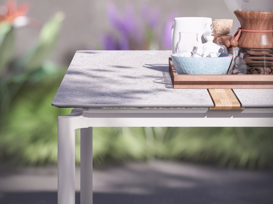 Der Zebra Liox Gartentisch Tisch Liox setzt auf eine robuste Materialkombination für den langjährigen Einsatz im Freien. Das Gestell besteht aus pulverbeschichtetem Aluminium in der Gestellfarbe light taupe. Diese Beschichtung sorgt für eine widerstandsfähige Oberfläche, die sehr pflegeleicht ist und Korrosion effektiv vorbeugt. Die Tischplatte ist aus HPL (High Pressure Laminate) gefertigt, einem besonders dichten Schichtstoff, der eine hohe Kratzfestigkeit und Formstabilität bietet und zugleich eine moderne, homogene Fläche schafft. Als optisches und funktionales Detail verfügt der Gartentisch über eine Tischplatteneinlage aus recyceltem und gebürstetem Teakholz, wodurch die natürliche Maserung betont und ein dezenter Kontrast zur Farbe sandstone entsteht.