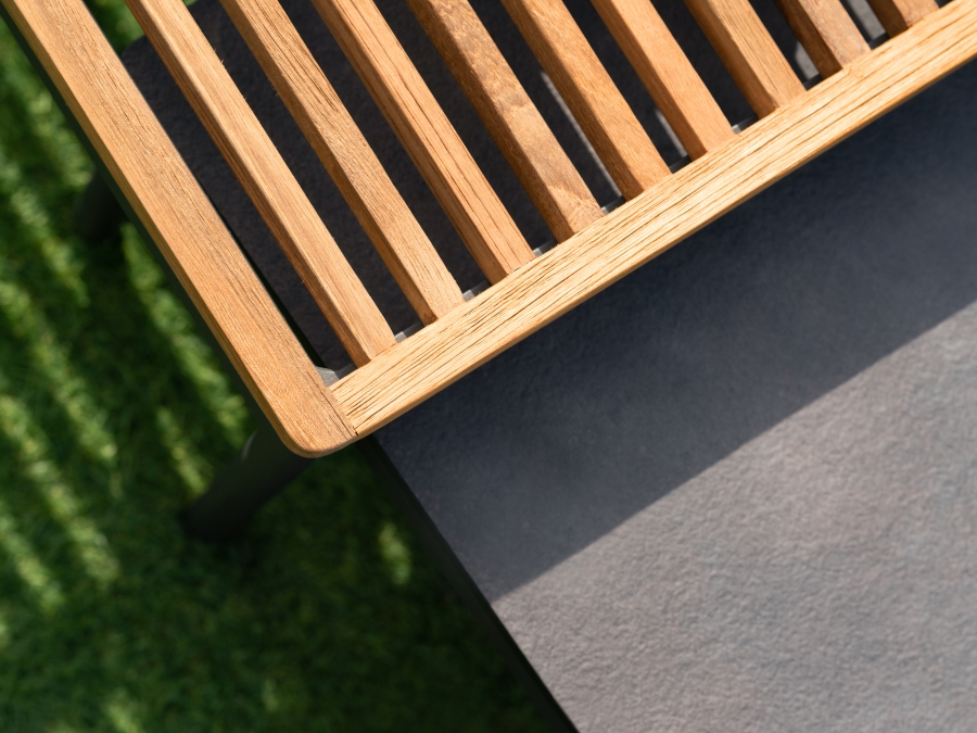 Der Zebra Max Lounge Kaffeetisch Teak kombiniert einen stabilen Rahmen aus pulverbeschichtetem Aluminium mit einer charaktervollen Tischplatte aus recyceltem Teakholz. Die Rahmenfarbe Graphit sorgt für eine zeitgemäße, klare Optik und unterstreicht den Lounge-Charakter. Das wiederverwendete Teakholz der Tischplatte verleiht dem Tisch eine natürliche, warme Ausstrahlung und macht jedes Exemplar zu einem Unikat. Durch die Verbindung von Holz und Metall entsteht ein harmonisches Gesamtbild, das sich sowohl in modern gestaltete Terrassen als auch in wohnliche Balkone einfügt.