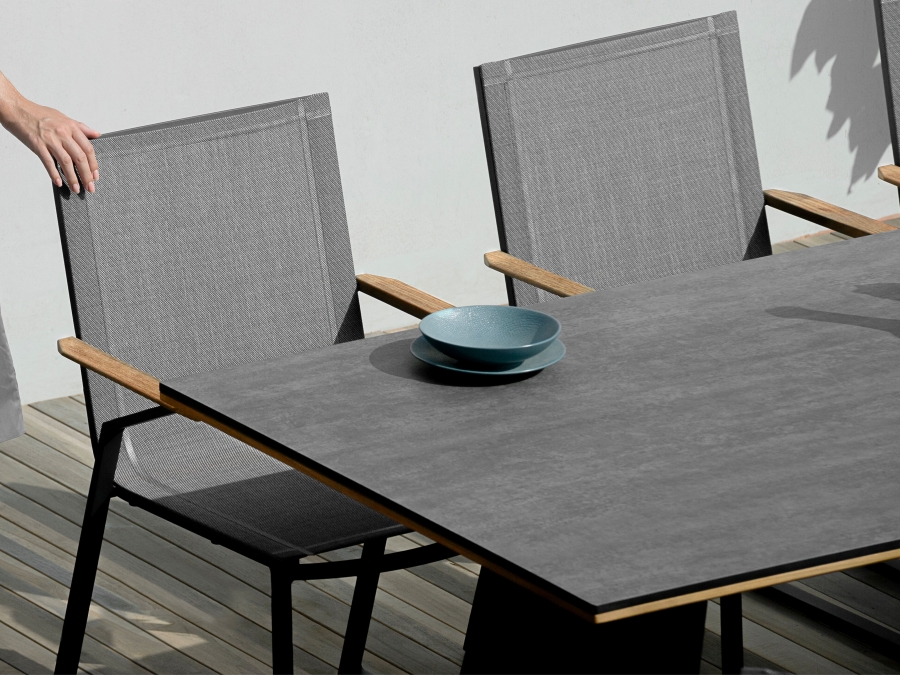 Das Gestell besteht aus pulverbeschichtetem Aluminium in Graphitfarbe, wodurch es rostfrei und robust ist. Die Armlehnen sind aus recyceltem Teakholz gefertigt, was dem Stuhl ein natürliches, warmes Aussehen verleiht. Vielleicht passt der Zebra Tamax Gartenstuhl optimal zu Ihrem vorhandenen Tisch oder zum angesagten Zebra Alex Gartentisch 220x100cm?