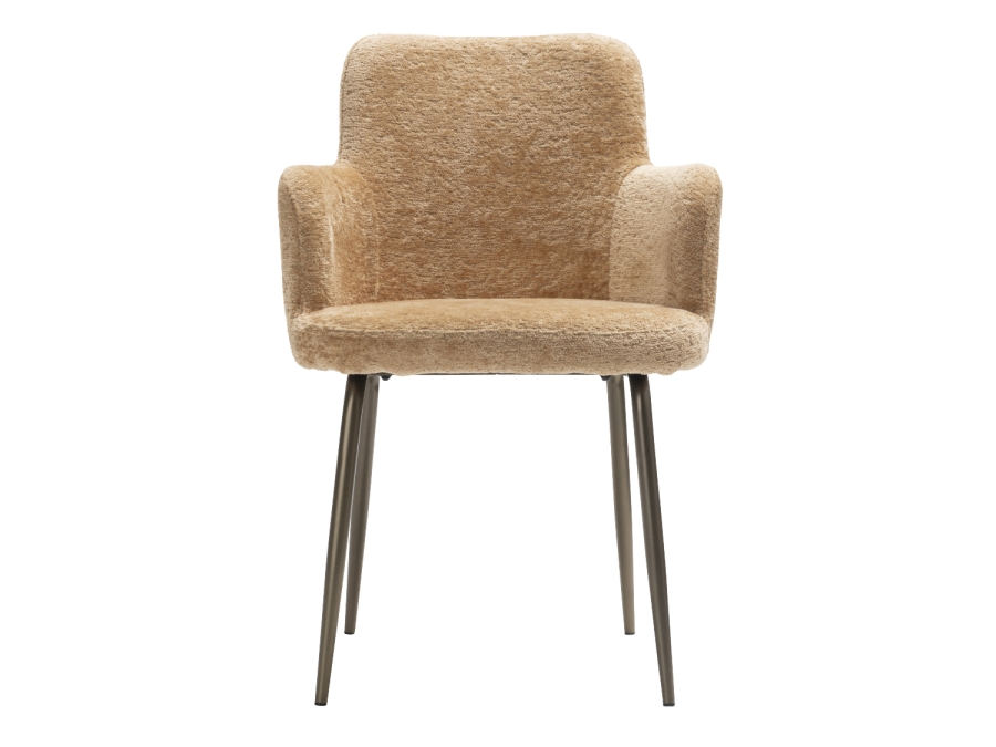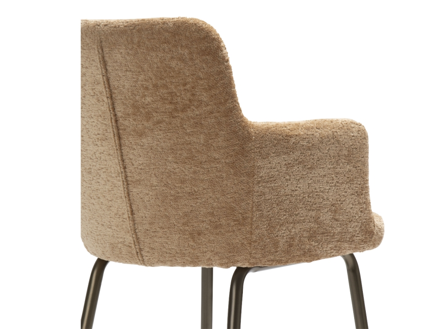 Der Bezug des Armlehnstuhls besteht aus hochwertigem Flachgewebe, das aus ca. 100% Polyester gefertigt ist. Diese Materialkombination bietet nicht nur einen hervorragenden Sitzkomfort, sondern auch eine hohe Langlebigkeit und Fülle. Der goldfarbene Metallrahmen unterstreicht die elegante Optik und sorgt für zusätzliche Stabilität.