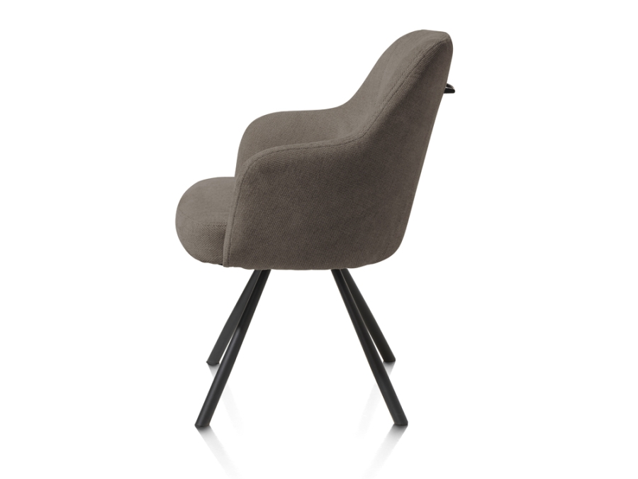 Der Armlehn-, Drehstuhl Eva besticht vor allem durch die Verwendung von hochwertigen Materialien. Der stilvolle Stuhl vereint einen Levigno-Polsterbezug in edlem Braun mit robusten, pulverbeschichteten Stahlbeinen, farblich abgestimmt in Rough off black. Dieses exquisite Materialzusammenspiel verleiht dem Stuhl nicht nur einen einzigartigen industriellen Chic, sondern gewährleistet auch seine Langlebigkeit und Stabilität.