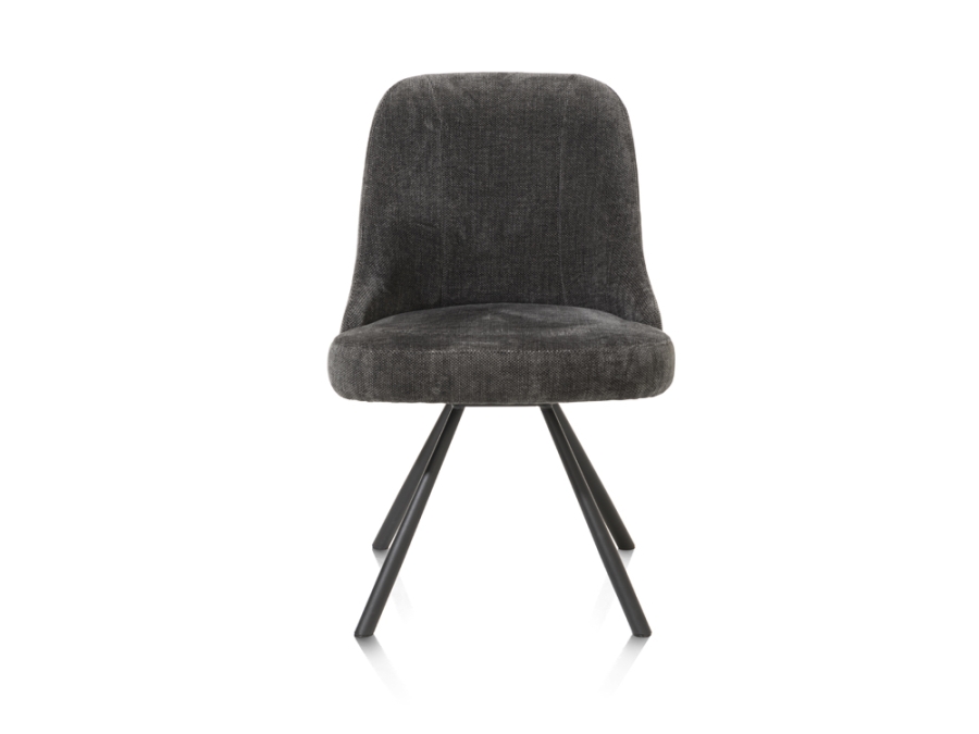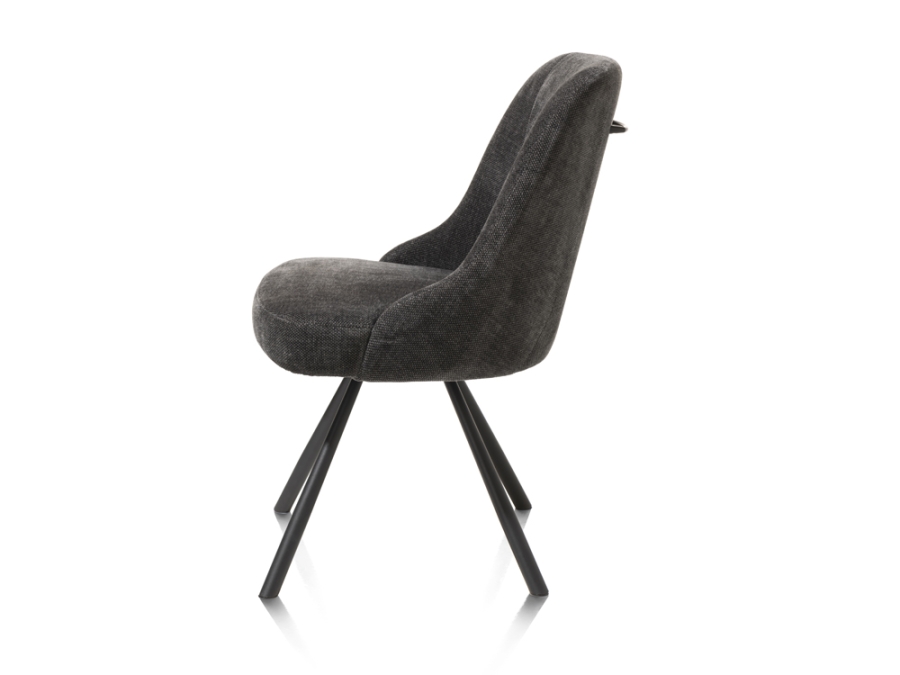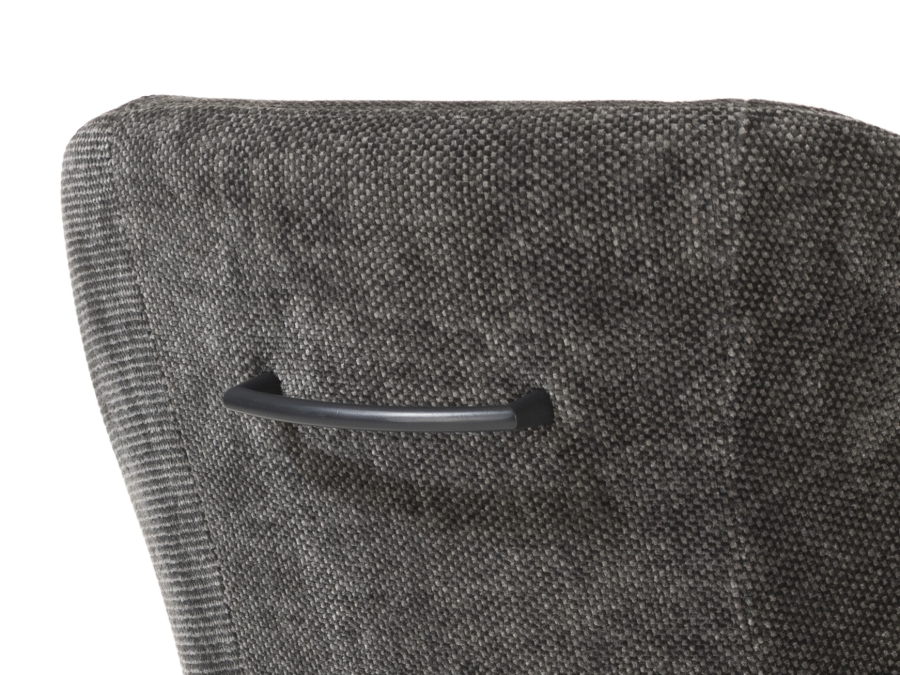 Der Drehstuhl Eva überzeugt mit hochwertigen Materialien. Der komfortable Chenille Polsterbezug in attraktiver Anthrazitfarbe gepaart mit pulverbeschichteten Stahlbeinen in Rough off black Farbe bietet eine harmonische Kombination aus Wärme und Industrie-Chic. Abgerundet wird das Design durch den modischen Griff an der Rückenlehne - ein handliches und stilvolles Detail, das diesem Stuhl eine besondere Note verleiht.