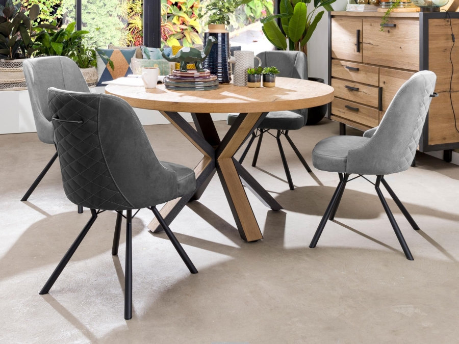 Die Essgarnitur besteht aus hochwertigem Edelstahl und sorgfältig ausgewähltem Holz, genauer gesagt aus furnierter Eiche in der Farbe railway brown. Diese Materialkombination gewährleistet nicht nur eine ansprechende Optik, sondern auch Langlebigkeit und Pflegeleichtigkeit.