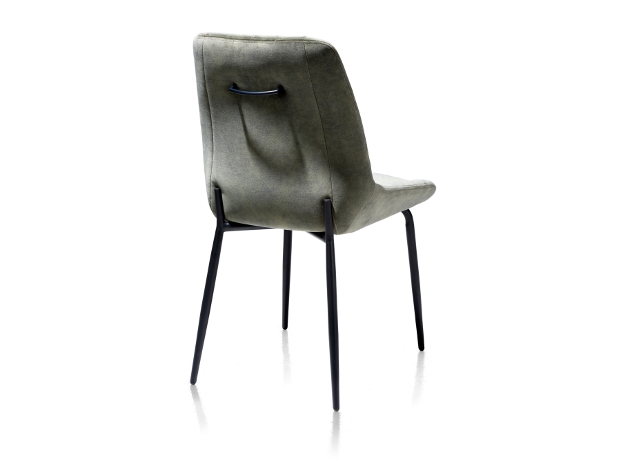 Der robuste Rahmen besteht aus starkem lackierten Stahl in der Farbe Schwarz und hält dem täglichen Gebrauch mühelos stand. Die bequeme Polsterung des Stuhls ist mit einem olivgrünen Stoff namens Karese bezogen. Die Längsnähte auf der Rückenlehne und Ziernähte erzeugen Kontraste und erhöhen das Interesse an der Design-Komposition. Als Zuschlagstoffe im Material wurden Edelstahl und Holz gewählt, was für zusätzliche Haltbarkeit und Festigkeit sorgt.