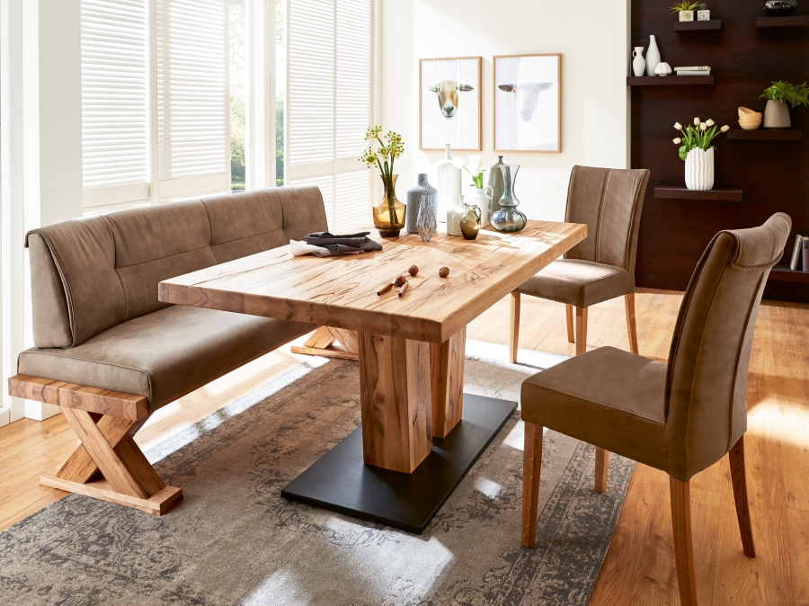 Die Alexa Essgruppe besticht durch die Verwendung von Edelstahl, Holz und Microfaser im Design. Der Tisch und die Gestelle von Stühlen und Bank sind aus nachhaltigem Eichenholz und robustem Edelstahl gefertigt, die eine hohe Langlebigkeit versprechen. Hinzu kommt eine Metallplatte in einem kräftigen Schwarzton, die ihre Ästhetik unterstreicht.