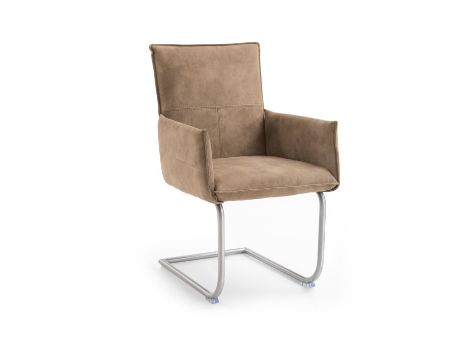 Beständigkeit und Langlebigkeit sind dank der Materialwahl garantiert: Das Gestell besteht aus gebürstetem Edelstahl, das durch seine Robustheit überzeugt und gleichzeitig eine ästhetische Note setzt. Der pflegeleichte Bezug des Stuhls wird aus Microfaser in der Farbe schlamm hergestellt, die nicht nur angenehm weich ist, sondern sich auch durch ihre Strapazierfähigkeit auszeichnet.