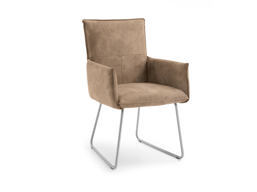 Gehalten wird der Stuhl von einem kufenförmigen Gestell aus gebürstetem Edelstahl, welches ihm eine edle Optik verleiht. Die angenehme Polsterung ist mit einem Microfaser Texas Bezug in schlammfarben überzogen. Dieser Bezug besteht aus 100% Polyester, ist daher äußerst pflegeleicht und schenkt zugleich ein angenehmes, gemütliches Sitzgefühl.