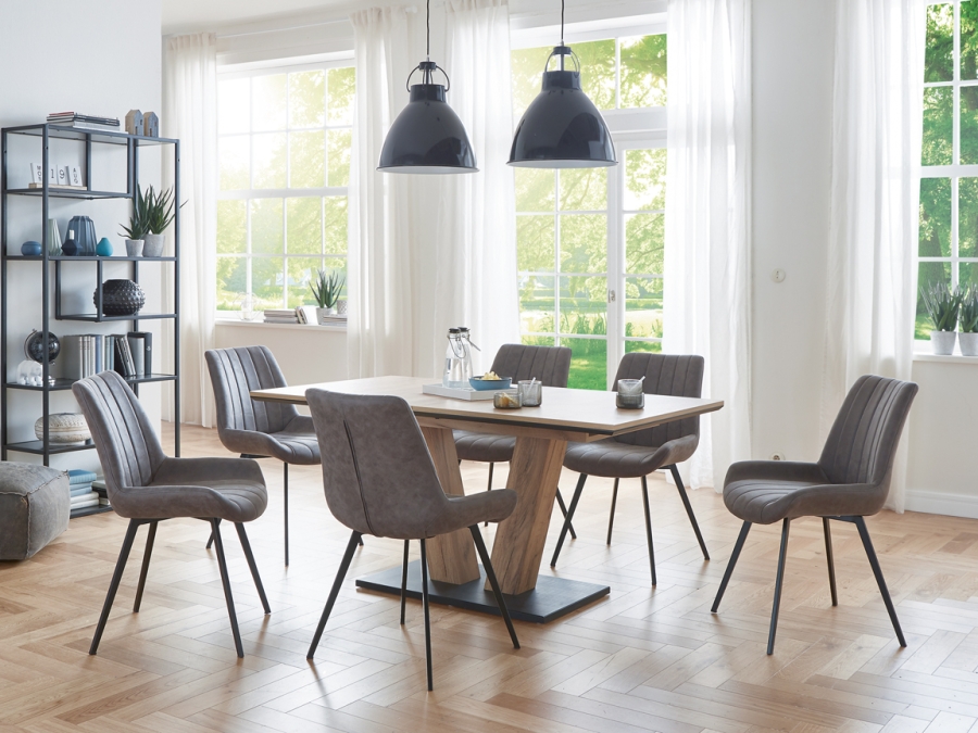 Der Tisch Milton punktet mit dem trendigen V-Gestell und der Tischplatte mit dem Dekor Struktureiche. Die Holzart Eiche zeugt von Qualität und Natürlichkeit, die Ihren Wohnraum aufwertet. Der Milton Tisch ist zudem erweiterbar und somit flexibel einsetzbar.