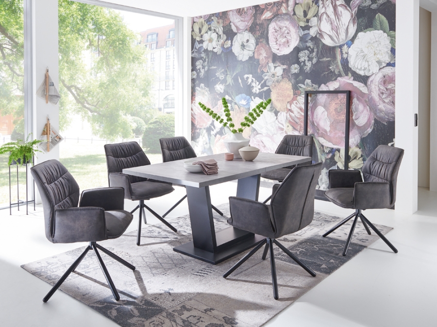 Der auffällige Materialmix verleiht dieser Essgruppe einen modernen und zugleich zeitlosen Charakter. Mit einem ausziehbaren Tisch, der mithilfe einer Einlegeplatte auf eine Gesamtlänge von ca. 200cm erweitert werden kann, bietet die Niehoff Malta-Tapas Essgruppe ausreichend Platz für gesellige Runden oder großzügige Festessen. Begleitet wird der Tisch von den bequemen Drehstühlen "Tapas", die sich durch ihre Formschönheit und den weichen Polster hervorheben. Sie sind pflegeleicht und zeigen sich mit einem legeren Bezug im Industriedesign, während das Stativgestell aus geschwärztem Eisen voll im Trend liegt.