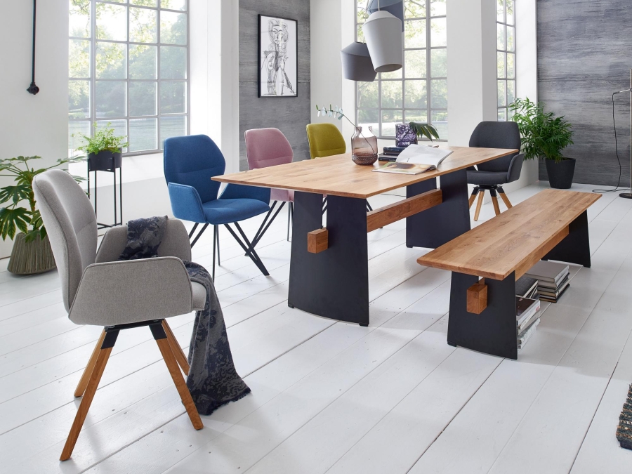 Diese Essgruppe besteht aus einem Designtisch, Designstühlen und einer Designbank. Sie sorgt für eine angenehme Atmosphäre, in der man nicht nur zum Essen gerne verweilt. Die Tischplatte in Kombination mit dem Eisengestell in Schwarz liegt absolut im Trend und lässt Ihren Essbereich zu einem Hingucker werden. Ebenso angesagt sind die Design-Armlehnstühle aus der gleichnamigen Serie Merlot. Das harmonische Zusammenspiel dieser Möbel beeindruckt auf der ganzen Linie und verspricht viele gemütliche Stunden.