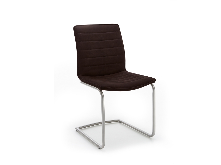 Das Gestell des Minimax Schwingstuhls besteht aus gebürstetem Edelstahl, einem robusten Material, das für seine Langlebigkeit und Stabilität bekannt ist. Als Sitz- und Rückenfläche dient der dunkelbraune Stoff Bogota, ein Polyesteranteil von 100 Prozent sorgt hier für hohen Sitzkomfort. Dank dieser Materialkombination aus Edelstahl und Microfaser steht diesem Stuhl nichts im Wege, um schnell zum Mittelpunkt Ihrer Essbereich-Gestaltung zu werden.