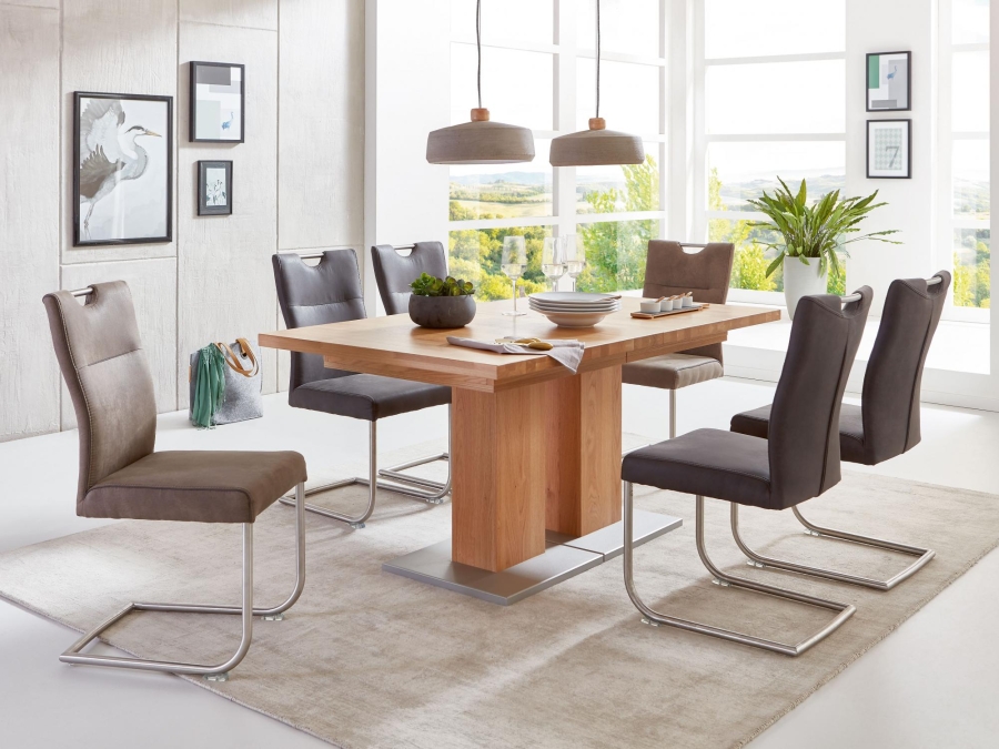 Bei dieser Essgruppe trifft Funktion auf Design: Der moderne Kulissentisch mit seinen sechs bequemen Schwingstühlen ermöglicht flexible Einrichtungsoptionen und lädt zum Verweilen ein. Für spontane Gäste oder größere Familienfeiern können die drei innenliegenden Einlegeplatten des Tisches im Handumdrehen erweitert und zusätzliche Sitzplätze geschaffen werden. Der Kulissentisch eignet sich hervorragend für Familienessen oder Dinner-Partys mit Freunden.