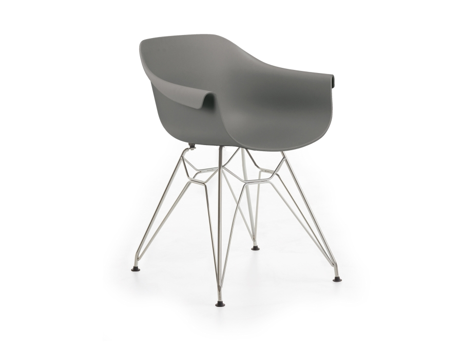 Der Schalensessel aufweist ein edles, verchromtes Gestell aus Eisen. Die Sitzfläche besteht aus robustem, grauem Kunststoff. Durch das hochwertige Edelstahl und Holz, das ebenfalls im Produktionsprozess verwendet wurde, bietet der Sessel eine hohe Langlebigkeit und Stabilität.