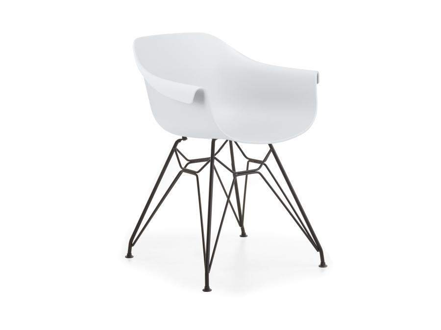 Der Sessel verfügt über ein robustes Gestell aus Eisen in der Farbe Schwarz. Die Sitzfläche besteht aus weißem Kunststoff und bietet dank der ergonomisch geformten Kunststoffsitzschale aus Polypropylen hohen Sitzkomfort. Die integrierten Armlehnen tragen ebenso zu einem angenehmen Sitzgefühl bei.