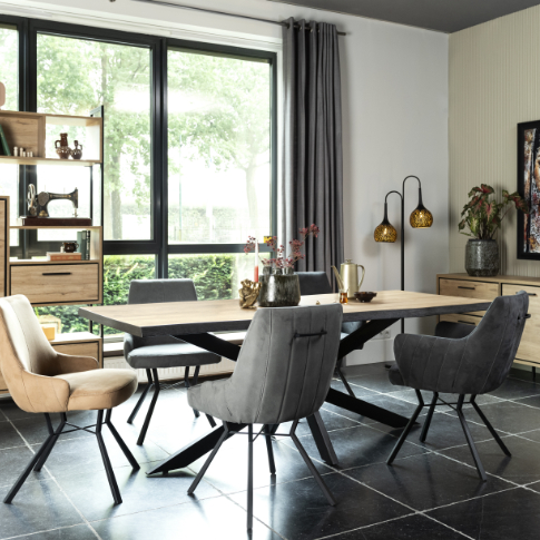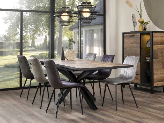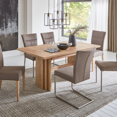 Zu den beliebtesten Serien von Niehoff zählen Milton, Primus und Santos. Die Serie Milton kombiniert eine Tischplatte in Struktureiche terra mit praktischem Mittelauszug und zwei innenliegenden Einlegeplatten. Der Tisch ist in zwei Größen erhältlich. Primus überzeugt mit pflegeleichter HPL-Oberfläche in Beton- oder Granitdesign. Das Gestell aus Eisen ist pulverbeschichtet oder in gebürstetem Edelstahl erhältlich und wahlweise mit normaler oder Trapezkufe ausgestattet. Der Tisch wird in verschiedenen Größen angeboten. Santos bringt mit einer massiven Akazienholzplatte in Natur und einem schwarzen Eisengestell rustikale Wärme ins Esszimmer. Auch dieses Modell ist in verschiedenen Größen erhältlich.