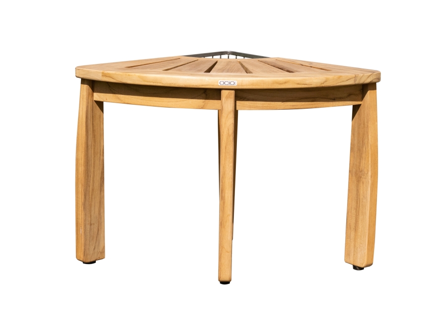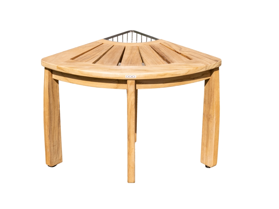Die Duschbank besteht aus hochwertigem Teakholz, das besonders langlebig und widerstandsfähig gegenüber Feuchtigkeit ist. Die Eckbank verfügt außerdem über eine Ablage aus robustem Edelstahl. Zusammen bilden diese beiden Materialien eine perfekte Kombination aus Luxus und Funktionalität.