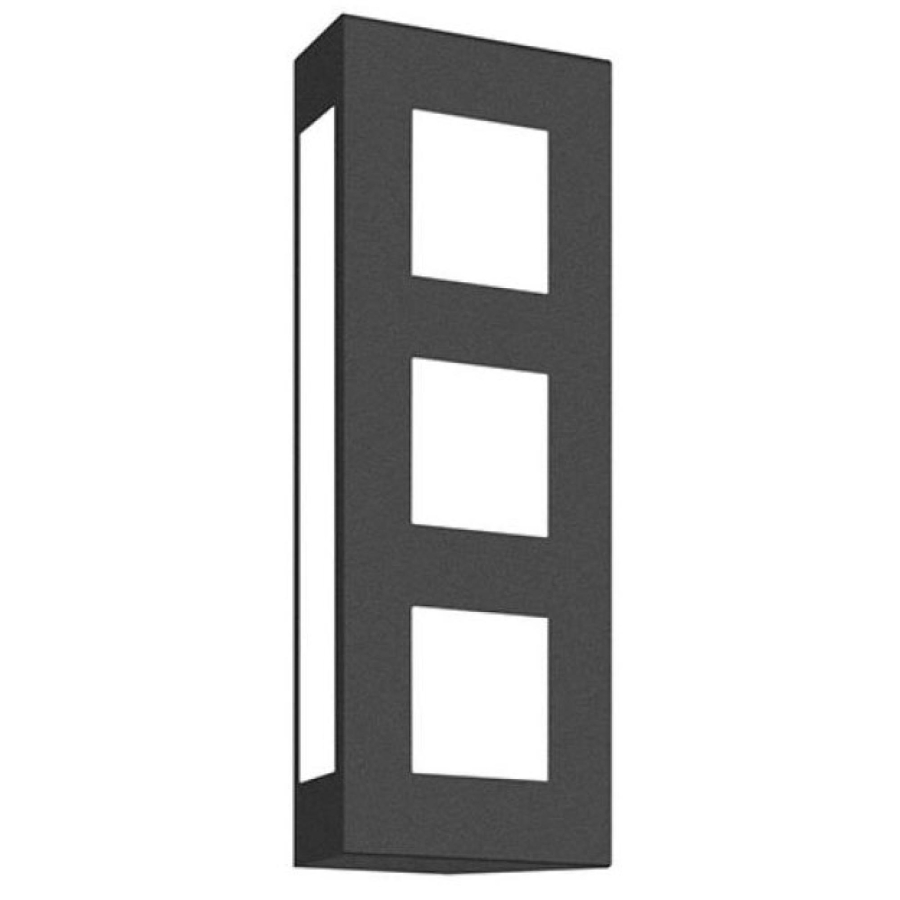Die CMD Wandleuchte aus der Serie Aqua Trilo zeichnet sich durch ihre präzise Handwerkskunst und hochwertige Materialien aus. Sie besteht aus anthrazit pulverbeschichtetem Edelstahl mit einer Blende aus Opalglas. Die drei Lichtausschnitte auf der Vorderseite und die Seitenausschnitte sind ebenfalls aus Opalglas gefertigt, das eine weiße, leicht transparente Folie enthält. Dadurch wird das Licht sanft gefiltert und eine angenehme, indirekte Beleuchtung erzeugt, ohne das verwendete Leuchtmittel sichtbar zu machen.