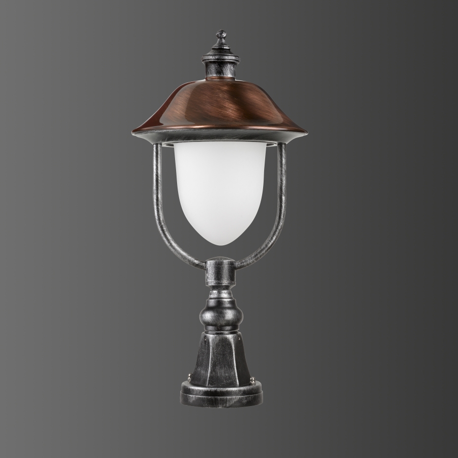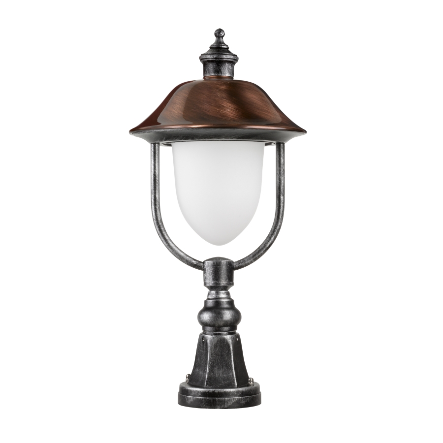 Das Material der Standleuchte besteht aus robustem Aluminium-Druckguss. Die Farbe Schwarz-silber mit einem eleganten Kupferdach passt sich nahtlos an jedes Ambiente an. Für eine gleichmäßige und weiche Lichtverteilung sorgt das Opalglas des Diffusors.