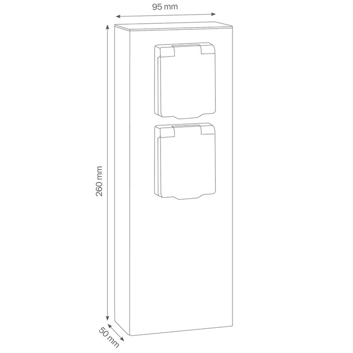 Diese Steckdosensäule ist 26 cm hoch und hat eine Basis, die ca. 9,5 cm breit und ca. 5,0 cm tief ist. Trotz ihrer kompakten Abmessungen bietet sie ausreichend Platz für zwei Stromanschlüsse. Sie hat ein Gewicht von ca. 3,50 kg, was eine stabile Aufstellung gewährleistet. Die LCD Steckdosensäule 019 ist innen verdrahtet und kommt mit einem innenliegenden Fuß zur Befestigung am Boden. Um die Installation zu erleichtern, ist der Erdspieß 097E separat erhältlich.