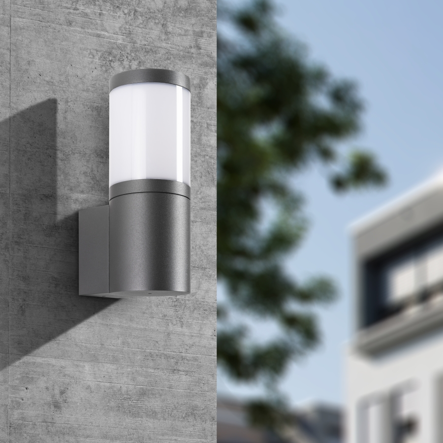 Die Wandleuchte besteht aus massivem Aluminium-Druckguss in der Farbe Graphit. Das Aluminium macht die Leuchte sowohl robust als auch stilvoll, während die Graphitfarbe einen modernen und eleganten Touch verleiht. Die Blende aus Polycarbonat erhöht die Haltbarkeit und Widerstandsfähigkeit der Leuchte zusätzlich.