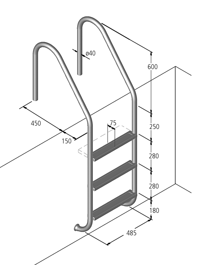 Der Durchmesser der Holme beträgt ca. 40 mm und sorgt für einen sicheren und grifffesten Halt, wenn Sie in das kühle Nass eintauchen oder dieses verlassen möchten. Zudem zeichnen sich die Holme durch eine Ausragung von ca. 60 cm über den Beckenrand hinaus aus, was den Einstieg zusätzlich erleichtert. Die Einbauhalterungen für die Befestigung werden ca. 45 cm hinter der Beckenkante montiert, ideal für Becken mit Überlaufrinne.