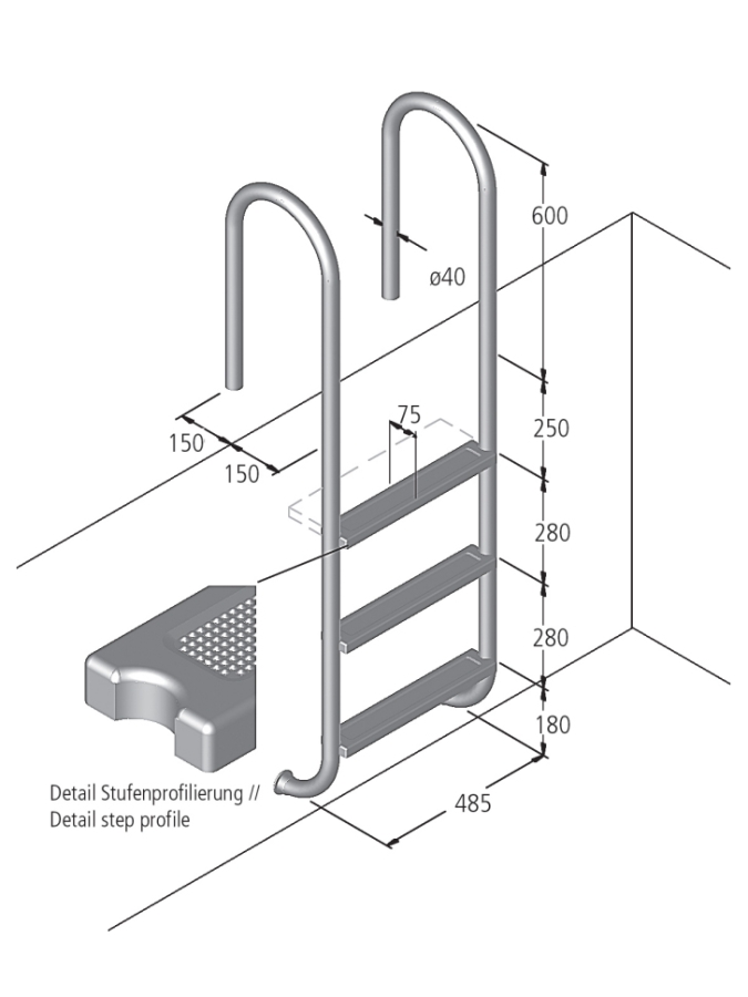 Die Leiter ist für den Einsatz in privaten Pools mit senkrechter Beckenwand und einer Mindestbeckentiefe von 1340 mm für 4 Stufen geeignet.