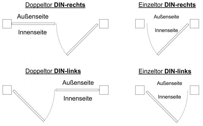 Die folgende Skizze erklärt die Begriffe DIN-links und DIN-rechts für die Bestimmung der Anschlagrichtung der Tore.