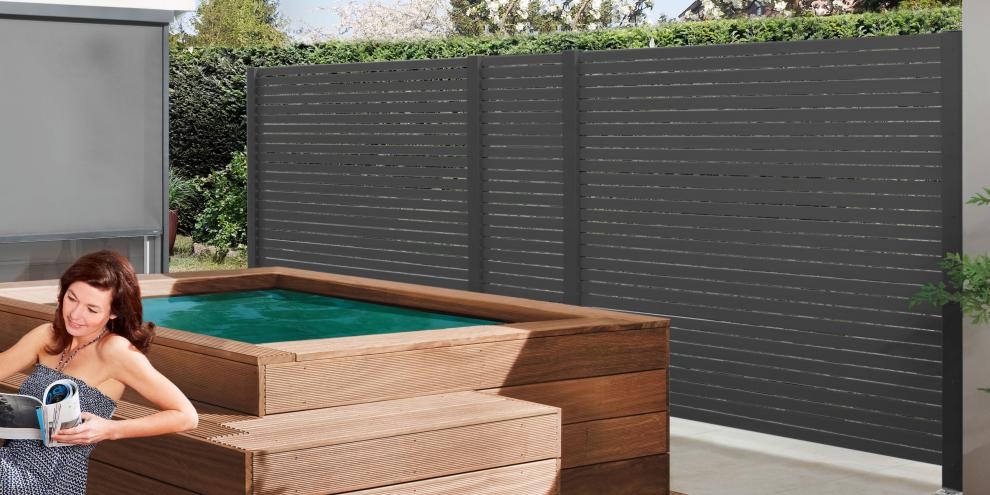 Zaunsystem Rhombus im Farbton anthrazit. Je nach Blickwinkel mit unterschiedlicher Transparenz.