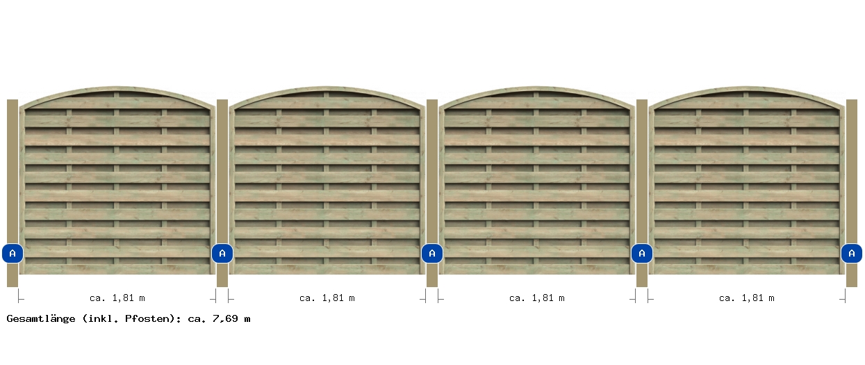 Der 7,69m Dichtzaun kdi mit Rundbogen hat eine Gesamtlänge von etwa 769 cm, was ihn zu einer hervorragenden Wahl für die Umfriedung größerer Bereiche macht, ohne dass multiple Elemente benötigt werden. Die großzügige Dimensionierung fördert auch den praktischen Nutzen als Wind- und Sichtschutz.