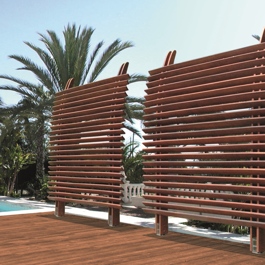 schräg gestellte Lamellen, oberer Teil leicht gebogen, ohne Rahmen, Profile auf Stelen eingefast, Abschlussprofil liegt auf ca. 165cm Höhe