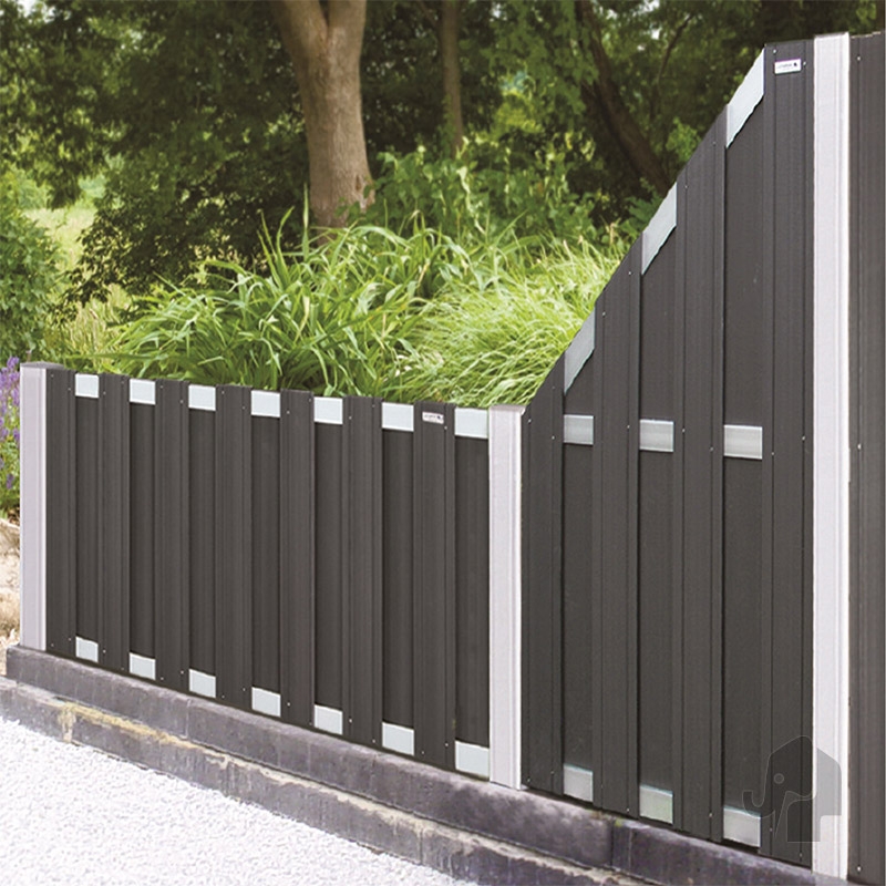 Das Abschlusselement besteht aus WPC (Wood Plastic Composite), einem Gemisch aus rund 50% Holz und 50% Kunststoff. Dieses Material ist bekannt für seine Widerstandsfähigkeit und seine extrem pflegeleichten Eigenschaften. Für einen zusätzlichen Hingucker sorgen die waagerechten Zaunriegel, welche aus Aluminium gefertigt sind. Die WPC Konstruktion wird mit diesen Zaunriegeln besonders in Szene gesetzt und ergänzt das moderne Design.