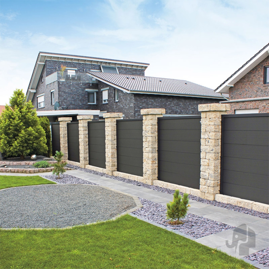 Das Zaunelement ist konsequent auf Langlebigkeit und geringe Pflege ausgelegt. Der umlaufende Rahmen besteht aus anthrazit pulverbeschichtetem Aluminium. Diese Bauweise sorgt für eine hohe Formstabilität und eine widerstandsfähige Oberfläche. Die Füllung besteht aus WPC, einem Verbundwerkstoff aus ca. 50% Holz und 50% Kunststoff. Diese Materialkombination verbindet die naturnahe Anmutung von Holz mit der Beständigkeit von Kunststoff und macht den Sichtschutzzaun extrem pflegeleicht. Die massiven WPC-Profile sind in Dunkle Farben gehalten und fügen sich harmonisch in moderne Gartenkonzepte ein.