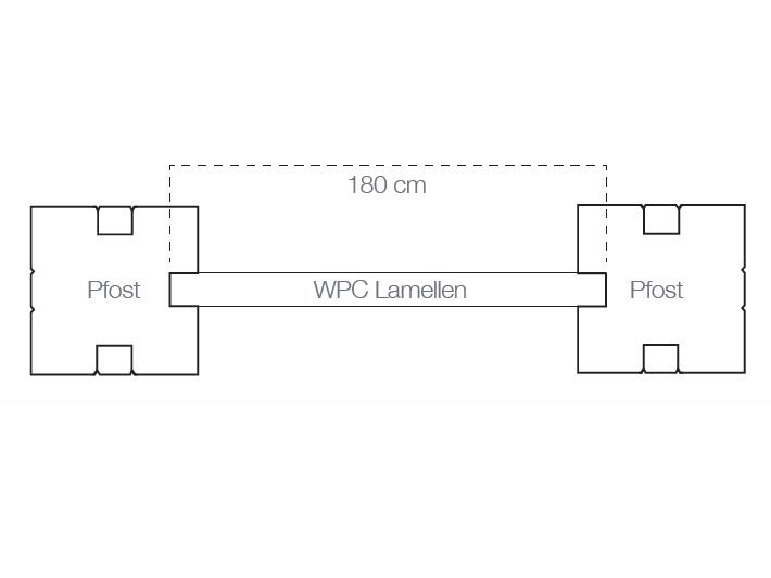 8 x WPC Lamellen, 7 x anthrazit pulverbeschichtete Alu-Mittelleisten, 2 x anthrazit pulverbeschichtete Alu-Abdeckleisten