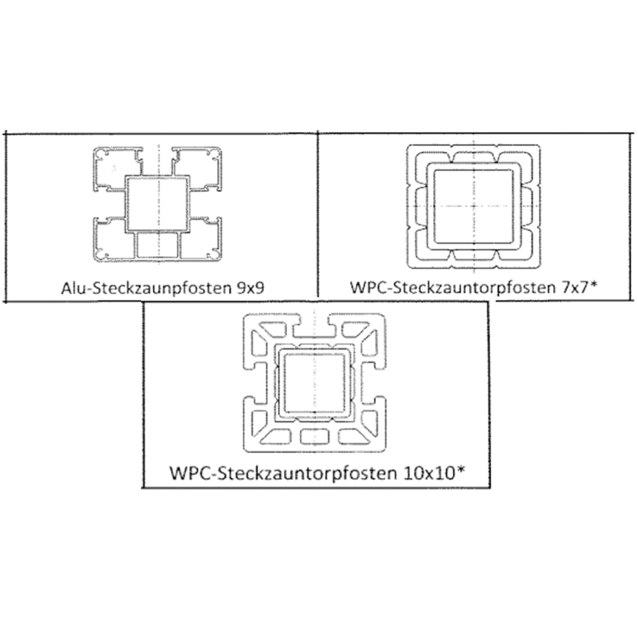Alu Steckzaunpfosten 9x9cm, WPC Steckzauntorpfosten 7x7cm, WPC Steckzauntorpfosten 10x10cm