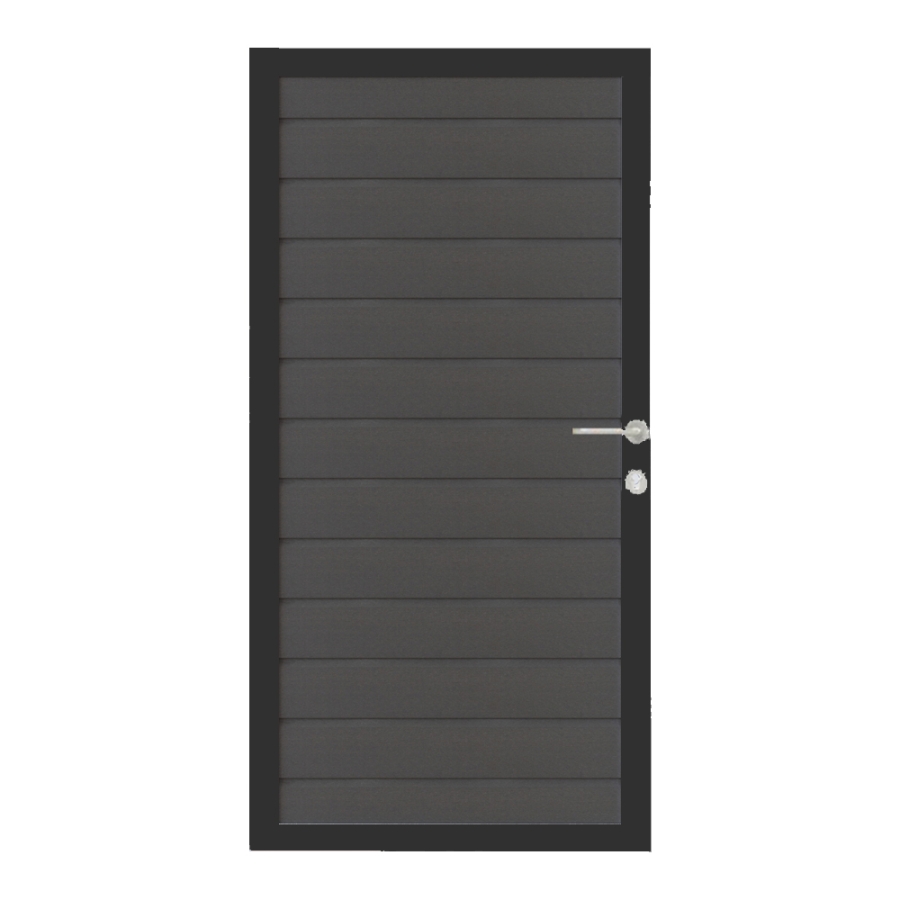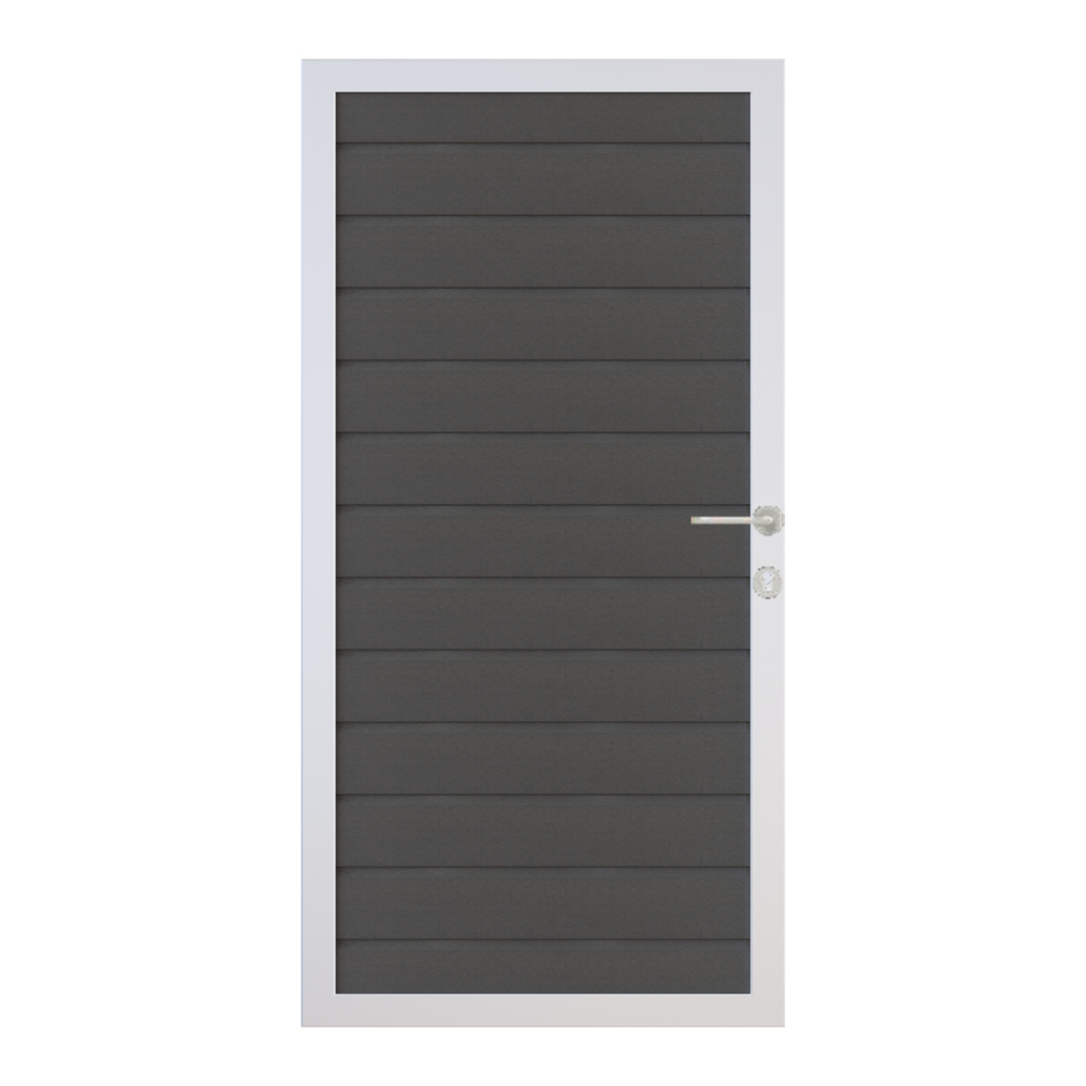 Die Füllung des Multi Fence Einzeltors besteht aus BPC, einem modernen Verbundwerkstoff aus ca. 60% Bambus und 40% Kunststoff. Dieser Materialmix vereint die naturnahe Anmutung von Holz mit der Robustheit von Kunststoff. Ergänzt wird dies durch einen stabilen Aluminium Rahmen, der dem Tor hohe Formstabilität und eine sehr gute Widerstandsfähigkeit gegenäber mechanischen Belastungen verleiht. In der Farbgebung hellgrau wirkt das Tor modern und zeitlos und lässt sich harmonisch in unterschiedliche Zaun- und Fassadengestaltungen integrieren.