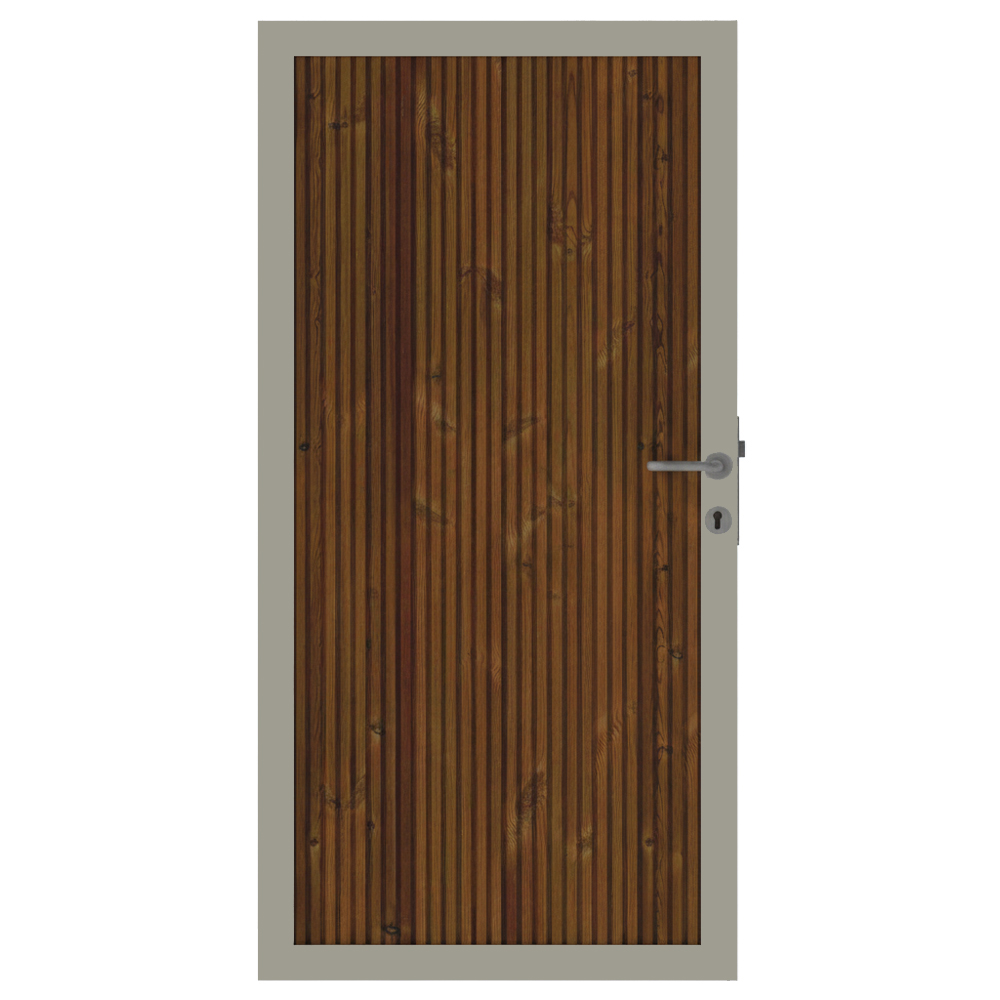 Im Lieferumfang des Osmo Trio Thermoholz Kiefer Einzeltor Sondermaß sind ein passendes Schließblech, ein Schloss, Bänder sowie ein funktionaler Griff enthalten.
