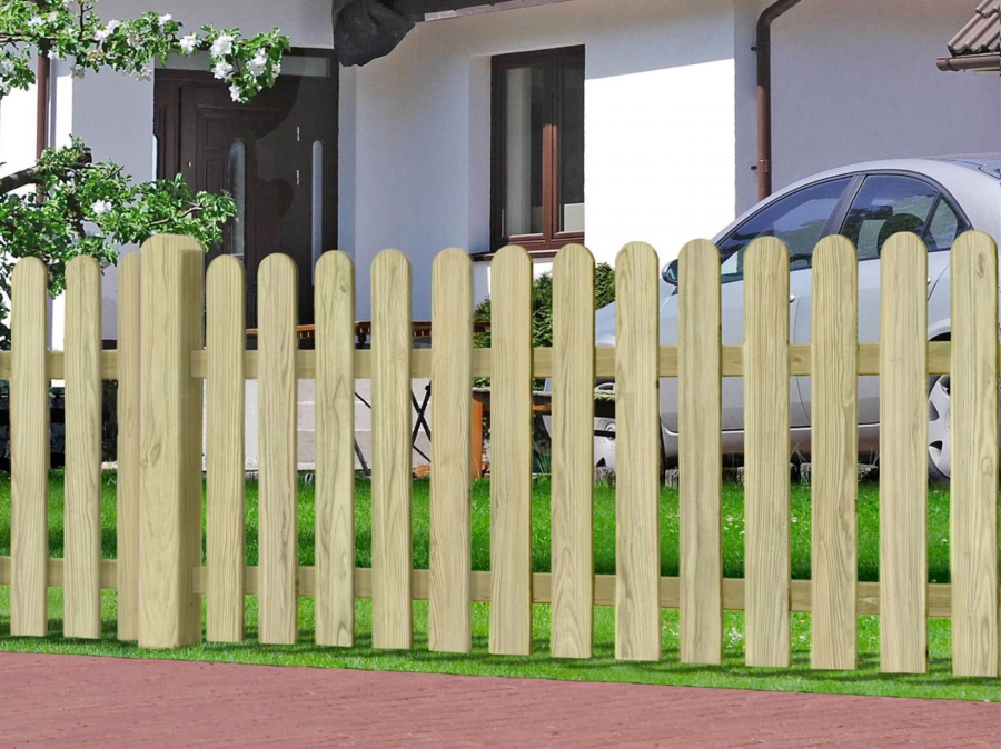Das Hauptelement besteht komplett aus Kiefer druckimprägniert grün. Dieses Nadelholz wird durch die Druckimprägnierung deutlich widerstandsfähiger gegen Feuchtigkeit und Witterungseinflüsse. Die insgesamt 13 senkrecht angeordneten Zaunlatten sind gehobelt und gefast, wodurch eine glatte, angenehm zu berührende Oberfläche entsteht. Die an den Oberseiten gerundet ausgeführten Lattenköpfe reduzieren Schmutz- und Wasseransammlungen und lassen das Hauptelement optisch gefällig wirken. Die Querleisten sind ebenfalls aus druckimprägnierter Kiefer gefertigt und sorgen durch ihre solide Ausführung für eine verlässliche Verbindung der Latten. In Kombination mit optional erhältlichem Zubehör wie Zaunbeschlag Edelstahl 4er-Set und Maschinenschraube 10x110mm - verzinkt mit Mutter entsteht ein stabiler und langlebiger Aufbau.